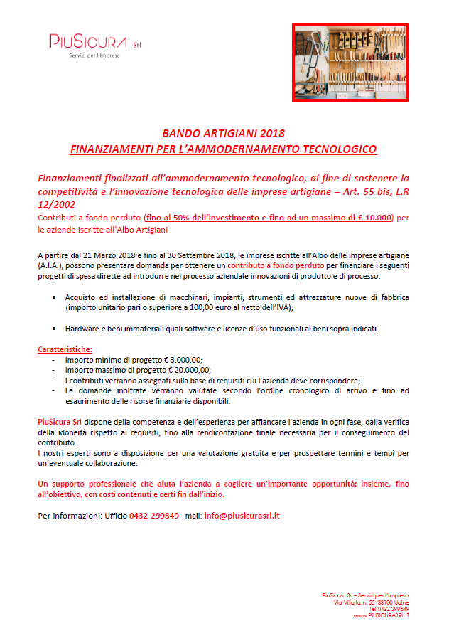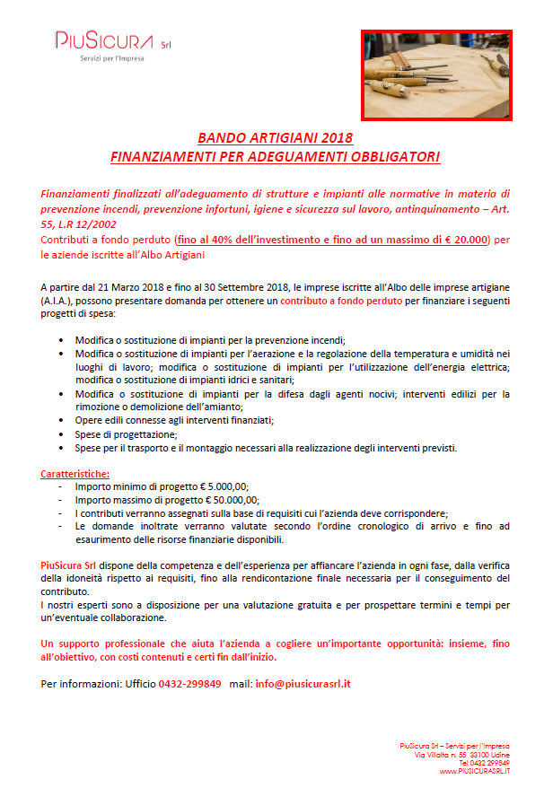 A partire da Marzo 2018 PiuSicura inizierà ad elaborare i progetti di investimento per le imprese iscritte all’Albo delle imprese artigiane (A.I.A.), le quali, ad apertura del portale avvenuta, potranno presentare domanda per ottenere un contributo a fondo perduto per finanziare i seguenti progetti di spesa: