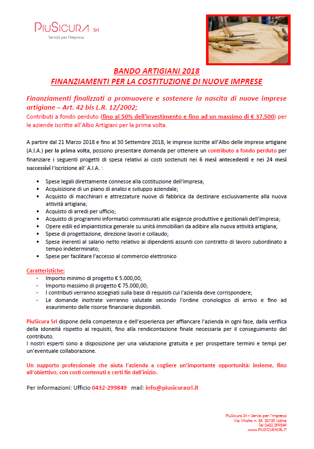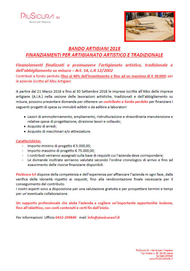 CONTRIBUTI A FONDO PERDUTO PER GLI ARTIGIANI IN FRIULI VENEZIA GIULIA